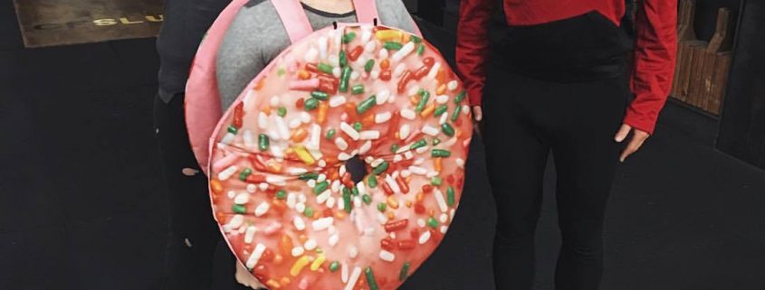 Leah, Andrea, Jon on Halloween – if you eat a donut after 5 weeks of no sugar or carbs, you might feel like Leah — a zombie!