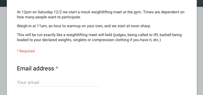 It’ll also be cool because the International Weightlifting Federation World Championships will be going on that entire week (and weekend) so you’ll have some live inspiration (and possibly witness some world records) during your performance!
