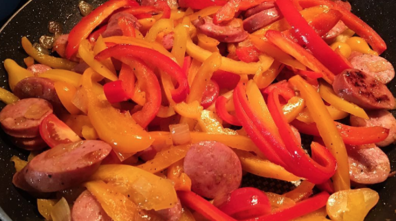 BCS: Named after one of our former coaches/athletes, she came up with this simple dish: Bell peppers + Cherry Tomatoes + Sausage cooked in olive oil. Easy. Also cool because those letters were also her initials.